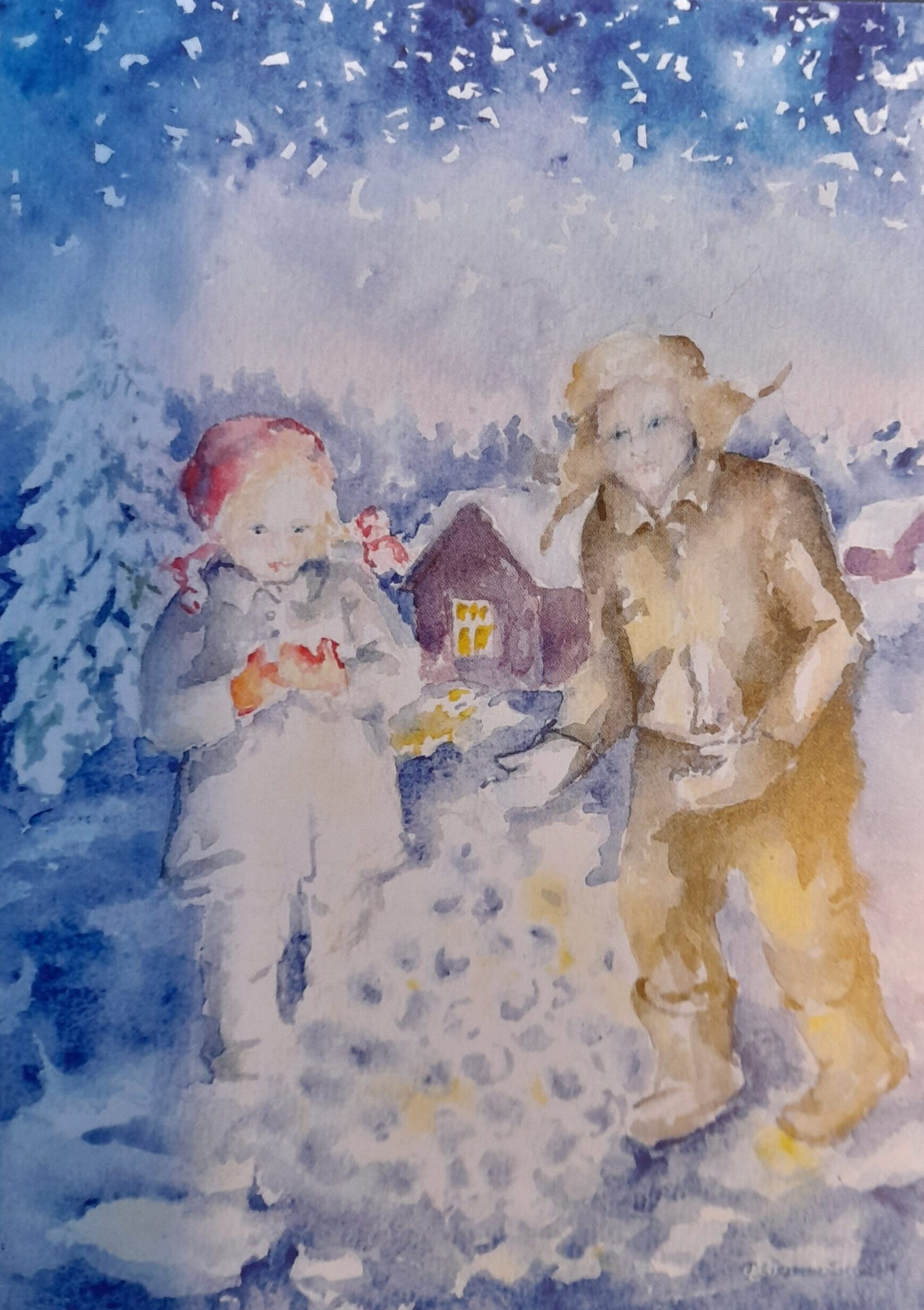 ”Kohtasin ystäväni Akvarellin kansakoulun toisella luokalla. Pulpettien päällä oli valmiina odottamassa työvälineet ja tarvikkeet. Opettajani Suoma Ikola oli tuonut malliksi orvokkikimpun karttatelineen päälle. Olin ihmeissäni enkä tiennyt mitä tehdä. Siinä sitten istuin ja ihmettelin tumput suorina. Hän tuli luokseni, otti siveltimen ja kostutti sen vesimukissa. Sitten hän otti käteensä pahvikansion, jossa värinapit olivat. Kostealla siveltimellä hän otti keltaista ja lisäksi sinistä. Syntyi kaunis vihreä väri, jolla hän maalasi orvokin lehden paperille. Sitten hän huuhtoi siveltimen puhtaaksi ja ”niisti” sen. Kostean kuivalla siveltimen reunalla hän otti esiin lehtisuonet. Lopputulos oli hieno. Kun sittemmin sain omat vesivärit, alkoi minullakin tuloksia syntyä.