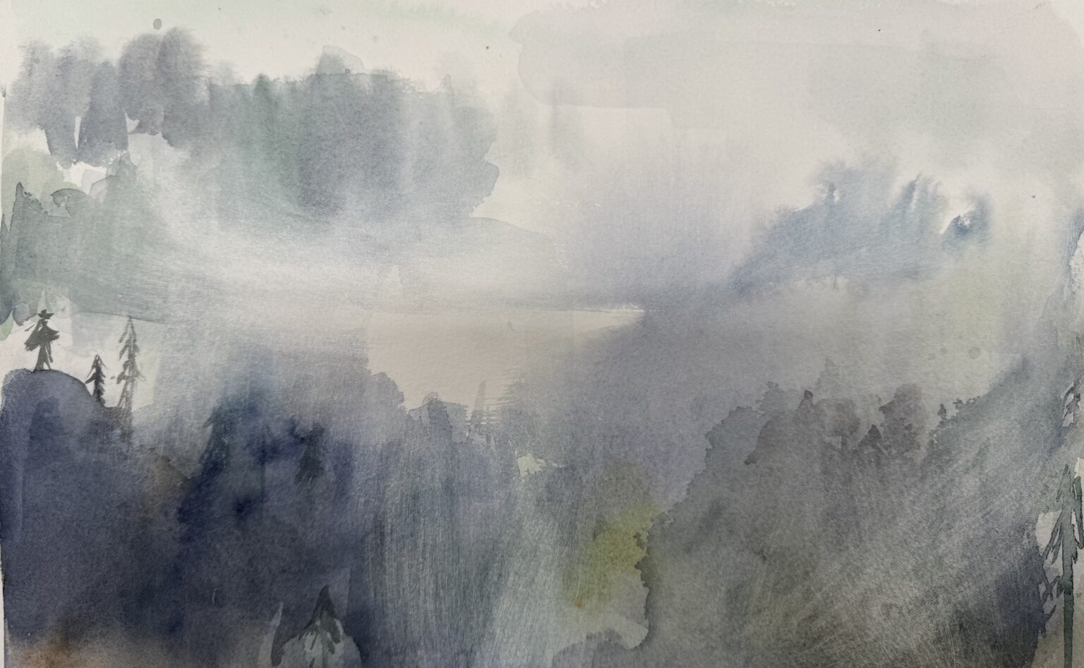 Märkä märälle ja märkä kuivalle -tekniikkoja kerroksellisesti hyödyntäen maalataan sumua ja usvaa maisemassa.